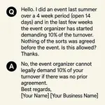 Hello. I did an event last summer over a 4 week period (open 14 days) and in the last few weeks the event organizer has started demanding 10% of the turnover.